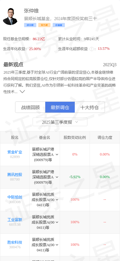 胜宏科技(300476)是基金大佬张仲维的重仓股。,其在整个职业生涯内年化收益高达25.0%。张仲维的大佬持仓 - 战绩回顾截图如下:
