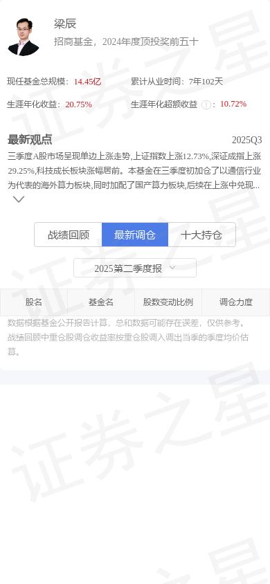 英维克(002837)是基金经理梁辰的重仓股。,其在整个职业生涯内年化收益高达20.75%。梁辰的大佬持仓 - 战绩回顾截图如下:
