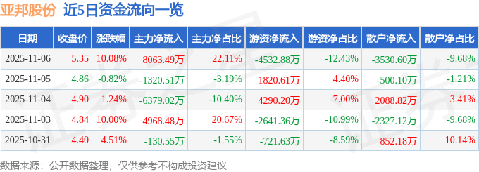 证券之星消息,截至2025年11月6日收盘,亚邦股份(603188)报收于5.35元,上涨10.08%,涨停,换手率12.25%,成交量69.82万手,成交额3.65亿元。