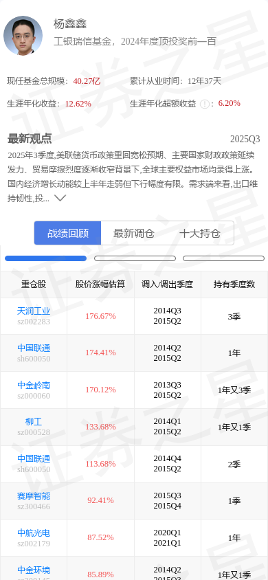 正泰电器(601877)是基金经理杨鑫鑫的重仓股。,其在整个职业生涯内年化收益高达12.62%。杨鑫鑫的大佬持仓 - 战绩回顾截图如下: