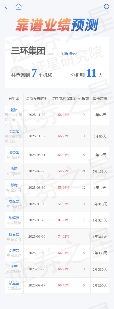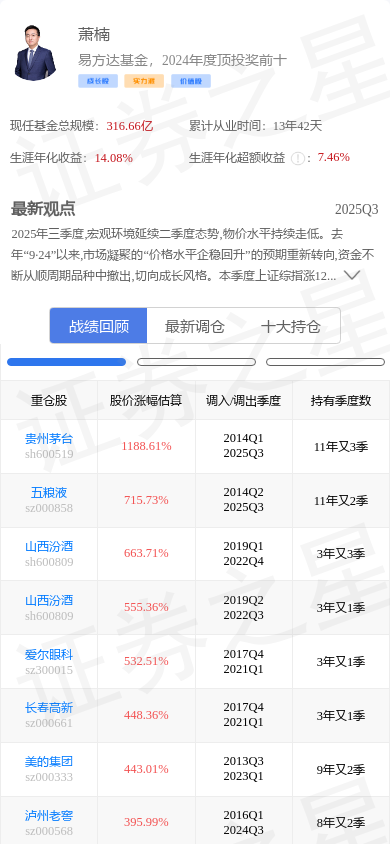 三环集团(300408)是基金大佬萧楠的重仓股。,其在整个职业生涯内年化收益高达14.08%。萧楠管理的易方达高质量严选三年持有基金在2024年4季度调入三环集团,在持有3个季度后在2025年3季度调出,持有期间的估算收益率达到5.21%。(以上数据经过后复权近似计算)萧楠的大佬持仓 - 战绩回顾截图如下: