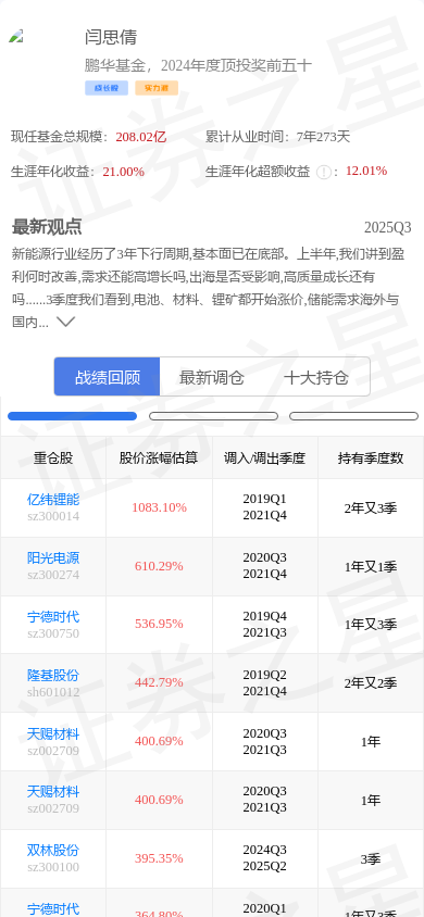 震裕科技(300953)是基金经理闫思倩的重仓股。,其在整个职业生涯内年化收益高达21.0%。闫思倩的大佬持仓 - 战绩回顾截图如下: