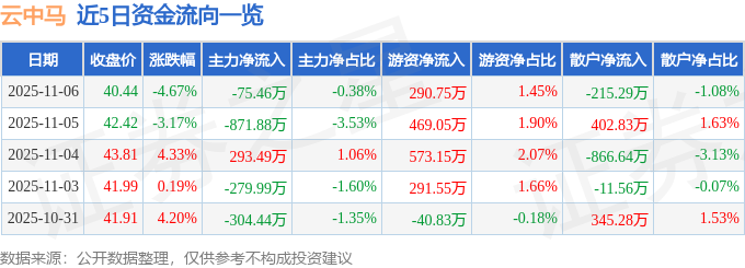 证券之星消息,截至2025年11月6日收盘,云中马(603130)报收于40.44元,下跌4.67%,换手率9.7%,成交量4.96万手,成交额2.0亿元。