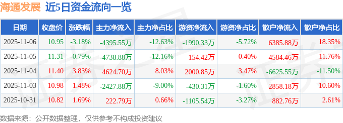 证券之星消息,截至2025年11月6日收盘,海通发展(603162)报收于10.95元,下跌3.18%,换手率11.4%,成交量31.78万手,成交额3.48亿元。