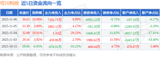11月6日的资金流向数据方面,主力资金净流入7192.71万元,占总成交额9.99%,游资资金净流出6995.52万元,占总成交额9.72%,散户资金净流出197.19万元,占总成交额0.27%。
