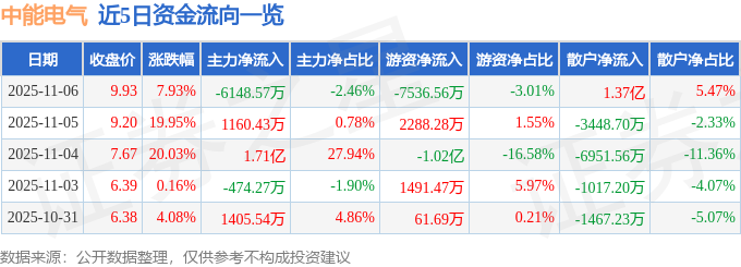证券之星消息,截至2025年11月6日收盘,中能电气(300062)报收于9.93元,上涨7.93%,换手率62.11%,成交量239.8万手,成交额25.0亿元。