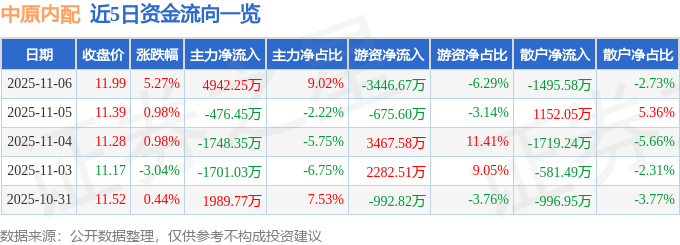 证券之星消息,截至2025年11月6日收盘,中原内配(002448)报收于11.99元,上涨5.27%,换手率10.05%,成交量45.77万手,成交额5.48亿元。