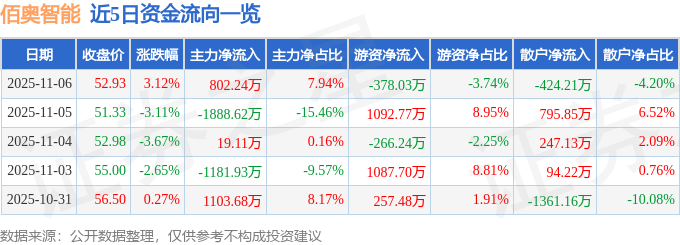证券之星消息,截至2025年11月6日收盘,佰奥智能(300836)报收于52.93元,上涨3.12%,换手率3.07%,成交量1.94万手,成交额1.01亿元。