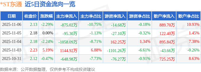 证券之星消息,截至2025年11月6日收盘,*ST东通(300379)报收于2.13元,下跌2.29%,换手率7.21%,成交量37.97万手,成交额8139.96万元。