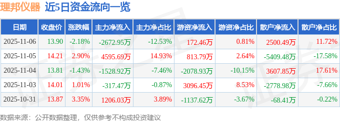 证券之星消息,截至2025年11月6日收盘,理邦仪器(300206)报收于13.9元,下跌2.18%,换手率4.54%,成交量15.35万手,成交额2.13亿元。