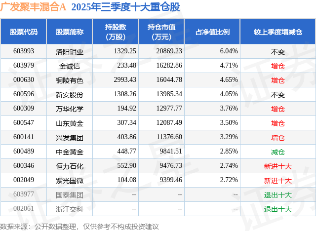 根据2025基金Q3季报公募基金重仓股数据,重仓该股的公募基金共50家,其中持有数量最多的公募基金为广发基金的广发聚丰混合A。广发聚丰混合A目前规模为33.66亿元,最新净值0.6616(11月5日),较上一交易日上涨0.64%,近一年上涨25.61%。该公募基金现任基金经理为苏文杰。苏文杰在任的基金产品包括:广发优势成长股票A,管理时间为2024年10月25日至今,期间收益率为30.89%;广发资源优选股票A,管理时间为2025年6月17日至今,期间收益率为18.98%;广发成长动力三年持有混合A,管理时间为2025年7月2日至今,期间收益率为24.22%。