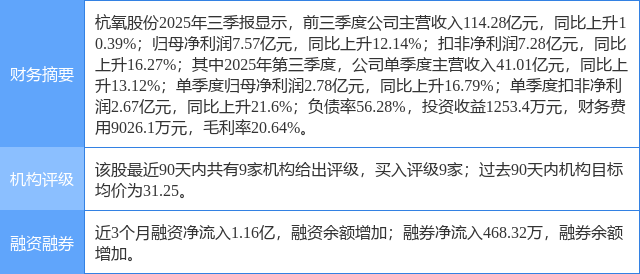 2025年8月26日,国金证券研究员满在朋发布了对杭氧股份的研报《气体利润超预期,看好气价与空分负荷》,该研报对杭氧股份给出“买入”评级。研报中预测25/26/27年公司实现归母净利润10.9/12.5/14.5亿元,同比+17.8%/+15.0%/+15.8%,对应当前PE为22/19/16x,维持“买入”评级。证券之星数据中心根据近三年发布的研报数据计算,该研报作者对此股的盈利预测准确度为95.92%。