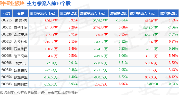 从资金流向上来看,当日种植业板块主力资金净流出2.18亿元,游资资金净流入2184.93万元,散户资金净流入1.97亿元。种植业板块个股资金流向见下表: