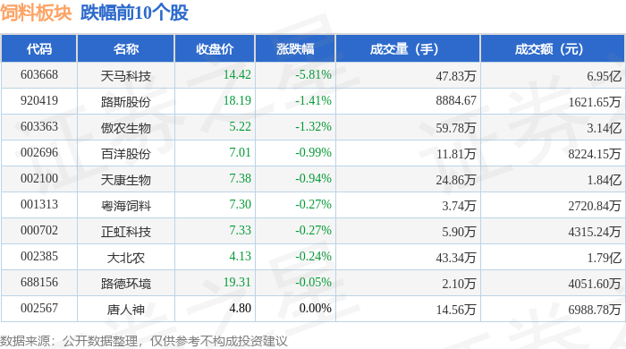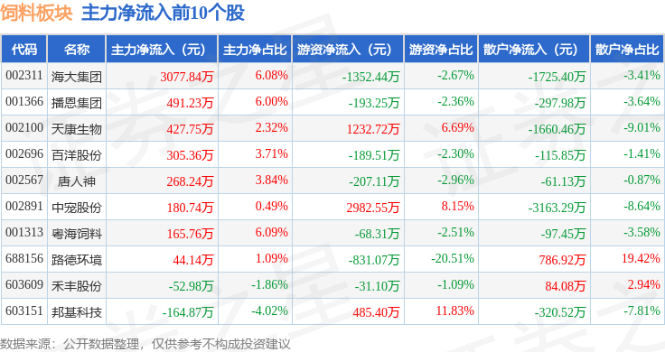 从资金流向上来看,当日饲料板块主力资金净流出9289.42万元,游资资金净流入7687.43万元,散户资金净流入1601.99万元。饲料板块个股资金流向见下表: