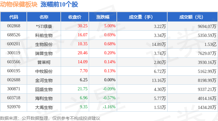 证券之星消息,11月6日动物保健板块较上一交易日上涨0.36%,*ST绿康领涨。当日上证指数报收于4007.76,上涨0.97%。深证成指报收于13452.42,上涨1.73%。动物保健板块个股涨跌见下表: