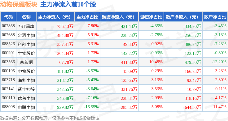 从资金流向上来看,当日动物保健板块主力资金净流出1747.08万元,游资资金净流入857.43万元,散户资金净流入889.65万元。动物保健板块个股资金流向见下表: