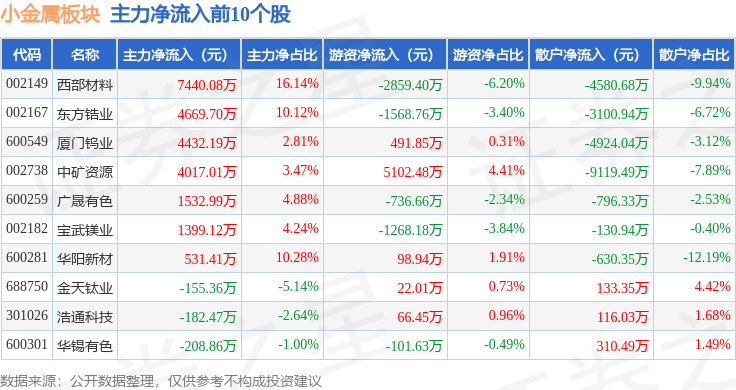 从资金流向上来看,当日小金属板块主力资金净流出3.63亿元,游资资金净流出2511.01万元,散户资金净流入3.88亿元。小金属板块个股资金流向见下表: