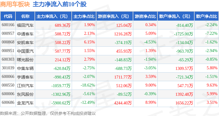 从资金流向上来看,当日商用车板块主力资金净流出4.14亿元,游资资金净流入1.53亿元,散户资金净流入2.6亿元。商用车板块个股资金流向见下表: