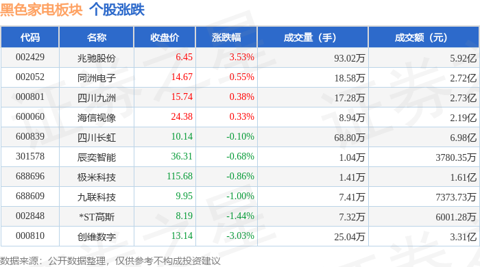 证券之星消息,11月6日黑色家电板块较上一交易日上涨0.35%,兆驰股份领涨。当日上证指数报收于4007.76,上涨0.97%。深证成指报收于13452.42,上涨1.73%。黑色家电板块个股涨跌见下表: