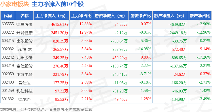 从资金流向上来看,当日小家电板块主力资金净流入6227.07万元,游资资金净流入477.43万元,散户资金净流出6704.5万元。小家电板块个股资金流向见下表: