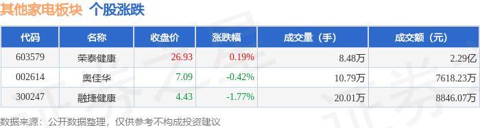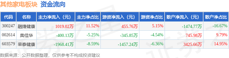 从资金流向上来看,当日其他家电板块主力资金净流出1349.52万元,游资资金净流出1347.34万元,散户资金净流入2696.87万元。其他家电板块个股资金流向见下表: