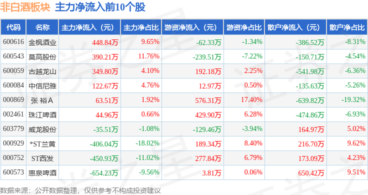 从资金流向上来看,当日非白酒板块主力资金净流出9984.02万元,游资资金净流入2967.09万元,散户资金净流入7016.94万元。非白酒板块个股资金流向见下表: