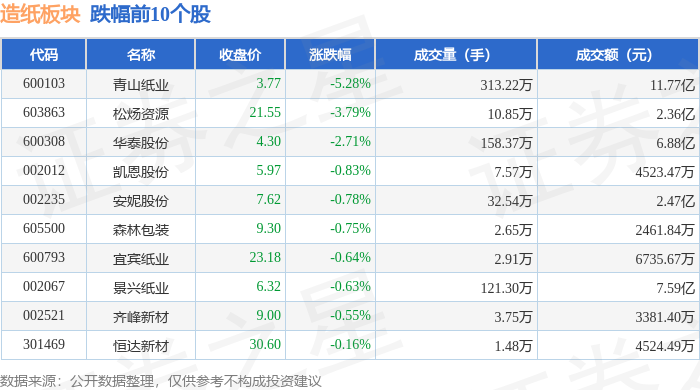 证券之星消息,11月6日造纸板块较上一交易日上涨0.03%,博汇纸业领涨。当日上证指数报收于4007.76,上涨0.97%。深证成指报收于13452.42,上涨1.73%。造纸板块个股涨跌见下表:
