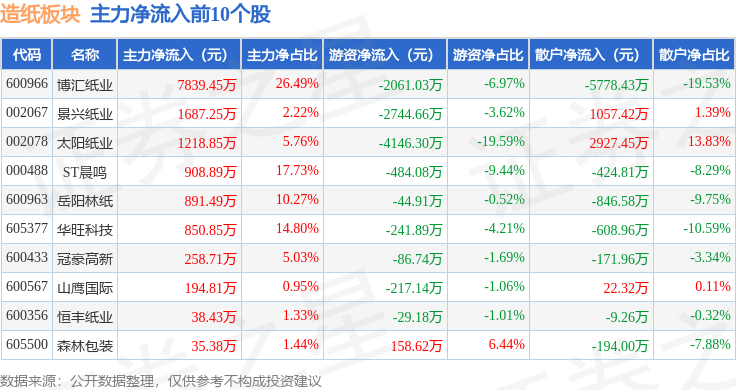 从资金流向上来看,当日造纸板块主力资金净流出2445.08万元,游资资金净流出1.25亿元,散户资金净流入1.49亿元。造纸板块个股资金流向见下表: