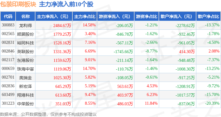 从资金流向上来看,当日包装印刷板块主力资金净流出2.64亿元,游资资金净流入9526.42万元,散户资金净流入1.68亿元。包装印刷板块个股资金流向见下表: