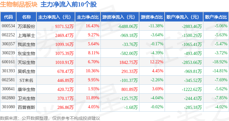 从资金流向上来看,当日生物制品板块主力资金净流出7.75亿元,游资资金净流入3.03亿元,散户资金净流入4.72亿元。生物制品板块个股资金流向见下表: