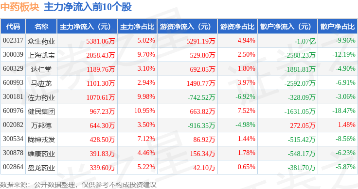 从资金流向上来看,当日中药板块主力资金净流出4.2亿元,游资资金净流入2.0亿元,散户资金净流入2.2亿元。中药板块个股资金流向见下表: