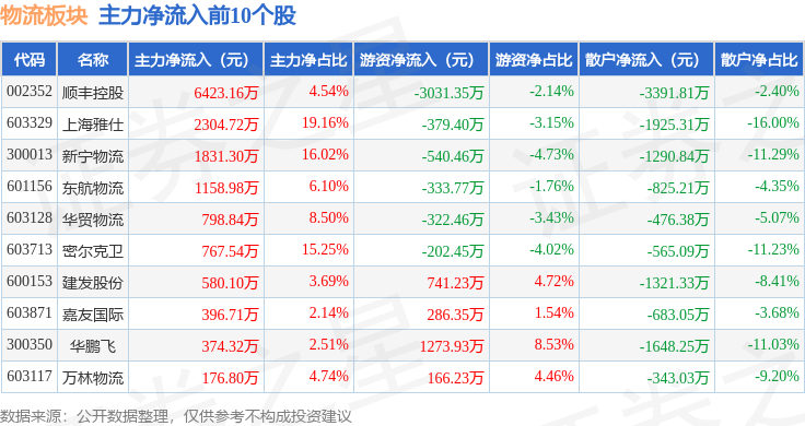 从资金流向上来看,当日物流板块主力资金净流出9434.34万元,游资资金净流入2910.38万元,散户资金净流入6523.97万元。物流板块个股资金流向见下表: