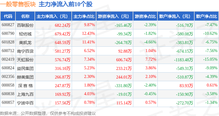 从资金流向上来看,当日一般零售板块主力资金净流出8.55亿元,游资资金净流入1.81亿元,散户资金净流入6.74亿元。一般零售板块个股资金流向见下表: