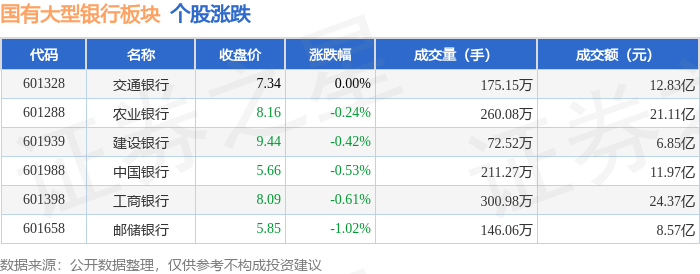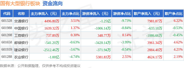 从资金流向上来看,当日国有大型银行板块主力资金净流出6185.65万元,游资资金净流出1.15亿元,散户资金净流入1.77亿元。国有大型银行板块个股资金流向见下表: