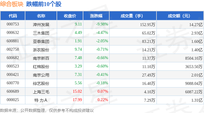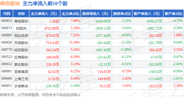 从资金流向上来看,当日综合板块主力资金净流出6401.14万元,游资资金净流出4449.33万元,散户资金净流入1.09亿元。综合板块个股资金流向见下表: