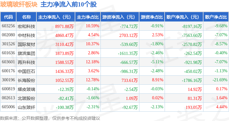 从资金流向上来看,当日玻璃玻纤板块主力资金净流入1.77亿元,游资资金净流出4995.38万元,散户资金净流出1.27亿元。玻璃玻纤板块个股资金流向见下表: