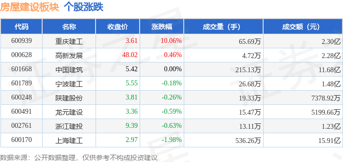 证券之星消息,11月6日房屋建设板块较上一交易日下跌0.0%,上海建工领跌。当日上证指数报收于4007.76,上涨0.97%。深证成指报收于13452.42,上涨1.73%。房屋建设板块个股涨跌见下表: