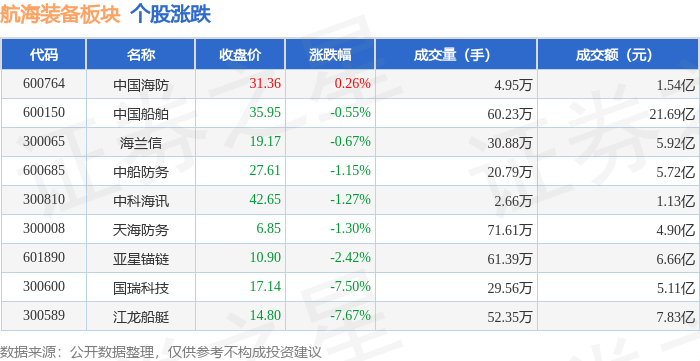 证券之星消息,11月6日航海装备板块较上一交易日下跌0.81%,江龙船艇领跌。当日上证指数报收于4007.76,上涨0.97%。深证成指报收于13452.42,上涨1.73%。航海装备板块个股涨跌见下表: