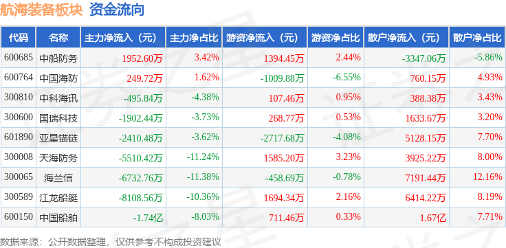 从资金流向上来看,当日航海装备板块主力资金净流出4.04亿元,游资资金净流入1575.45万元,散户资金净流入3.88亿元。航海装备板块个股资金流向见下表: