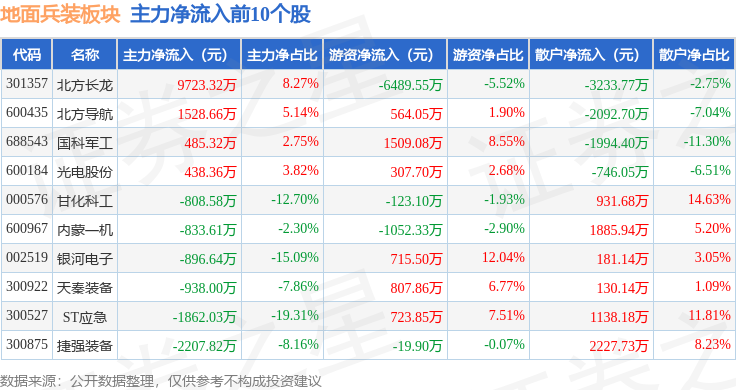 从资金流向上来看,当日地面兵装板块主力资金净流出7350.77万元,游资资金净流出971.85万元,散户资金净流入8322.62万元。地面兵装板块个股资金流向见下表: