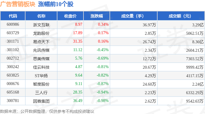 证券之星消息,11月6日广告营销板块较上一交易日下跌1.6%,天下秀领跌。当日上证指数报收于4007.76,上涨0.97%。深证成指报收于13452.42,上涨1.73%。广告营销板块个股涨跌见下表: