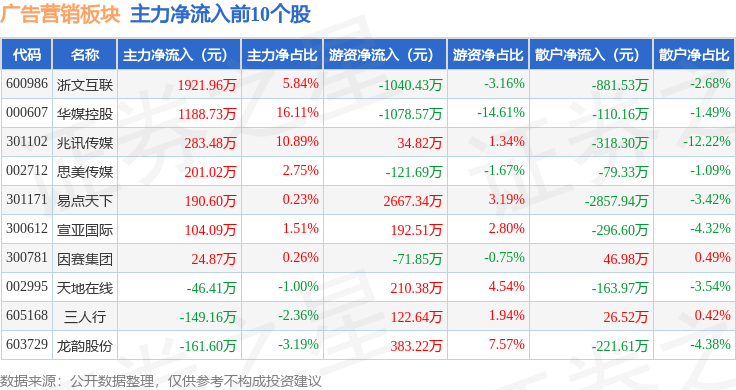 从资金流向上来看,当日广告营销板块主力资金净流出10.22亿元,游资资金净流入1.69亿元,散户资金净流入8.53亿元。广告营销板块个股资金流向见下表:
