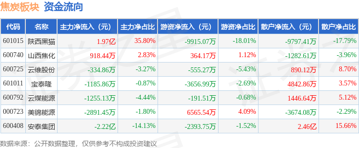 从资金流向上来看,当日焦炭板块主力资金净流出7274.0万元,游资资金净流出9782.89万元,散户资金净流入1.71亿元。焦炭板块个股资金流向见下表: