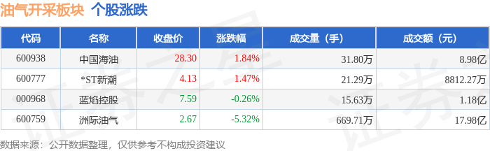 证券之星消息,11月6日油气开采板块较上一交易日上涨0.99%,中国海油领涨。当日上证指数报收于4007.76,上涨0.97%。深证成指报收于13452.42,上涨1.73%。油气开采板块个股涨跌见下表: