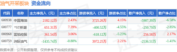 从资金流向上来看,当日油气开采板块主力资金净流入1759.24万元,游资资金净流入6678.87万元,散户资金净流出8438.1万元。油气开采板块个股资金流向见下表:
