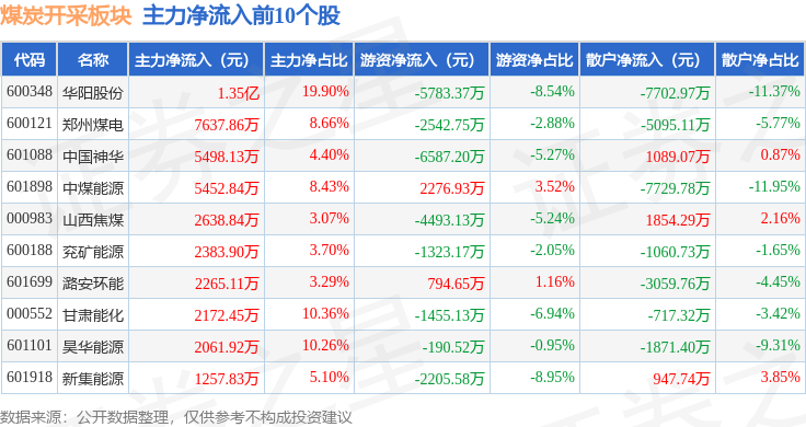 从资金流向上来看,当日煤炭开采板块主力资金净流入1.43亿元,游资资金净流出1.61亿元,散户资金净流入1813.92万元。煤炭开采板块个股资金流向见下表: