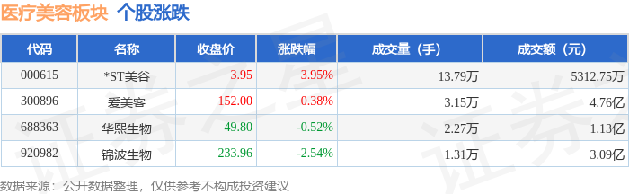 证券之星消息,11月6日医疗美容板块较上一交易日上涨0.18%,*ST美谷领涨。当日上证指数报收于4007.76,上涨0.97%。深证成指报收于13452.42,上涨1.73%。医疗美容板块个股涨跌见下表: