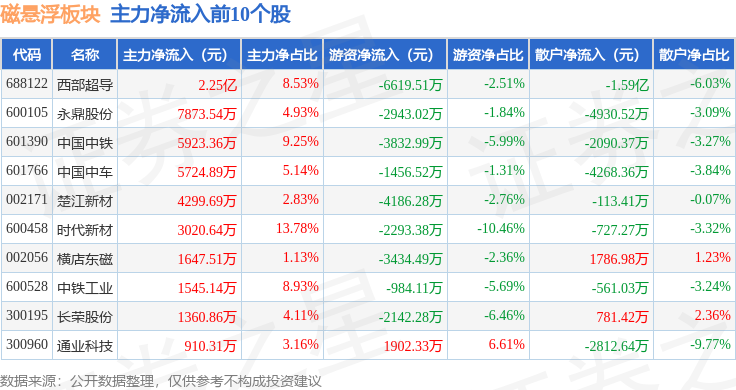 从资金流向上来看,当日磁悬浮板块主力资金净流出1.42亿元,游资资金净流出4626.57万元,散户资金净流入1.88亿元。磁悬浮板块个股资金流向见下表:
