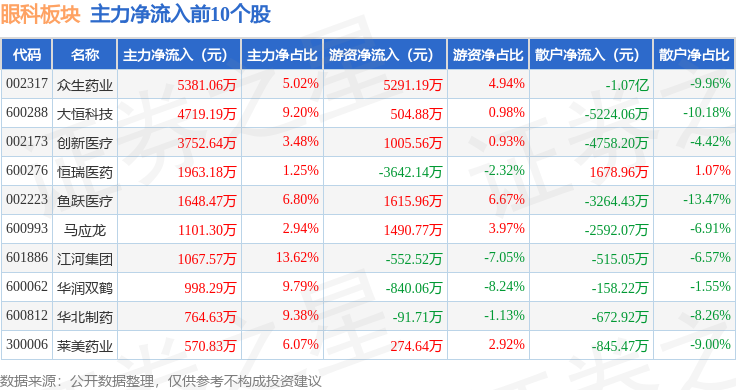 从资金流向上来看,当日眼科板块主力资金净流出3.43亿元,游资资金净流入2.94亿元,散户资金净流入4894.94万元。眼科板块个股资金流向见下表: