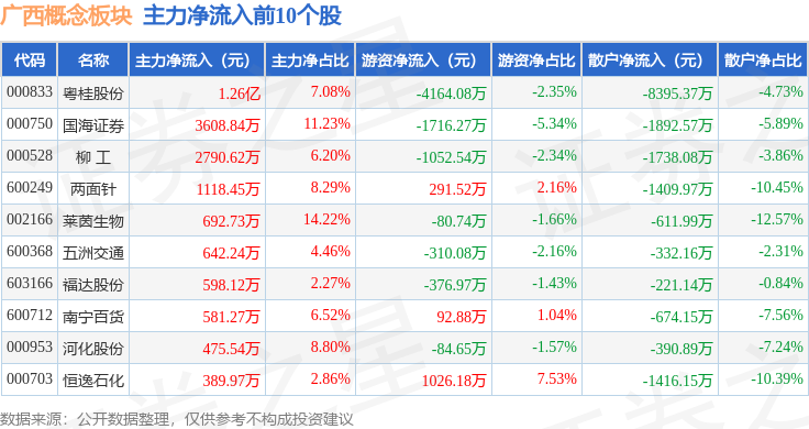 从资金流向上来看,当日广西概念板块主力资金净流入2898.7万元,游资资金净流出4089.55万元,散户资金净流入1190.85万元。广西概念板块个股资金流向见下表: